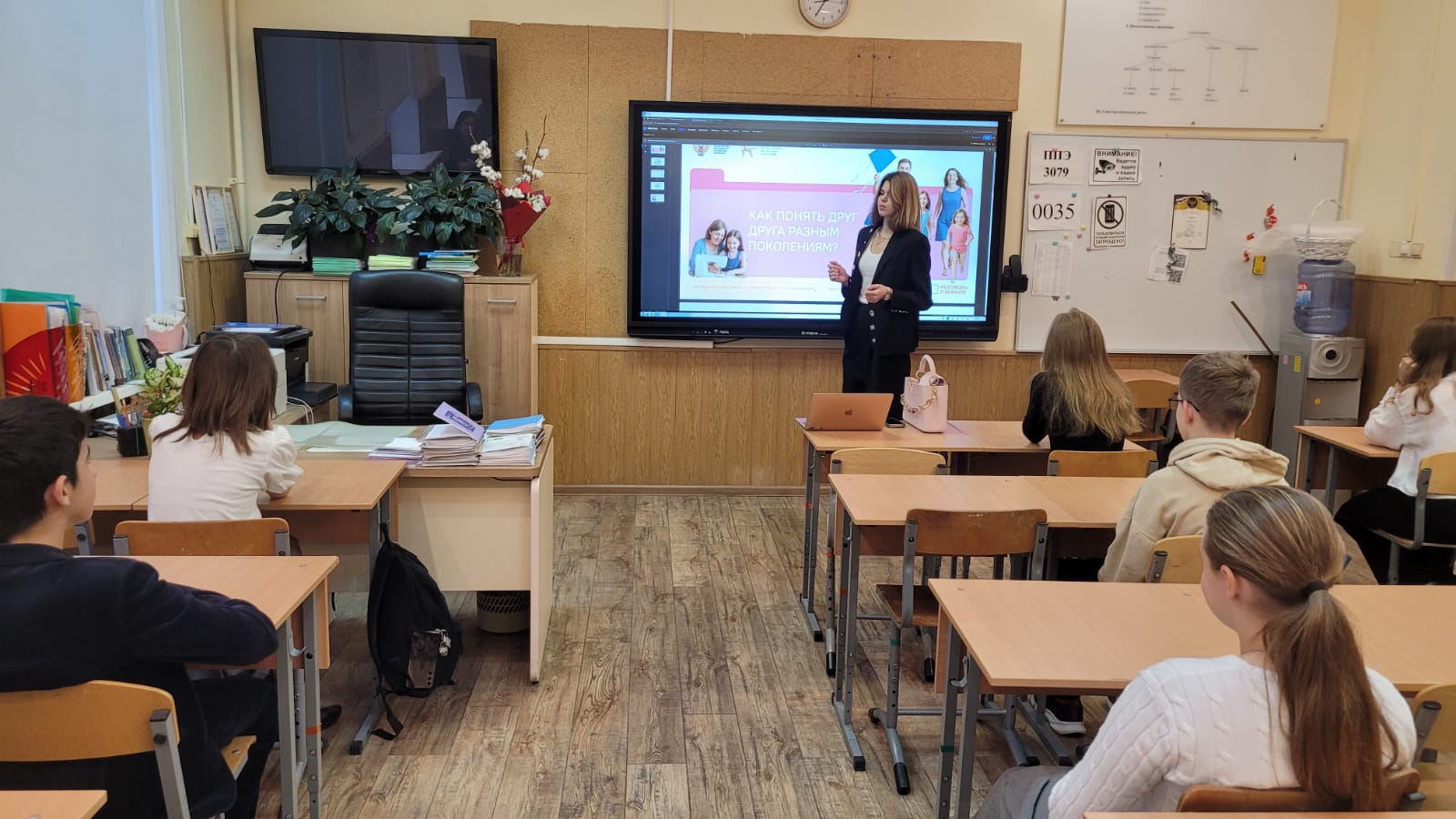 Классный руководитель 7 класса "Б", учитель русского языка и литературы Воронина Оксана Евгеньевна пригласила для проведения урока выпускницу 2023 года Егорову Анастасию, чтобы поговорить с учениками на тему "Как разным поколениям понять друг друга".